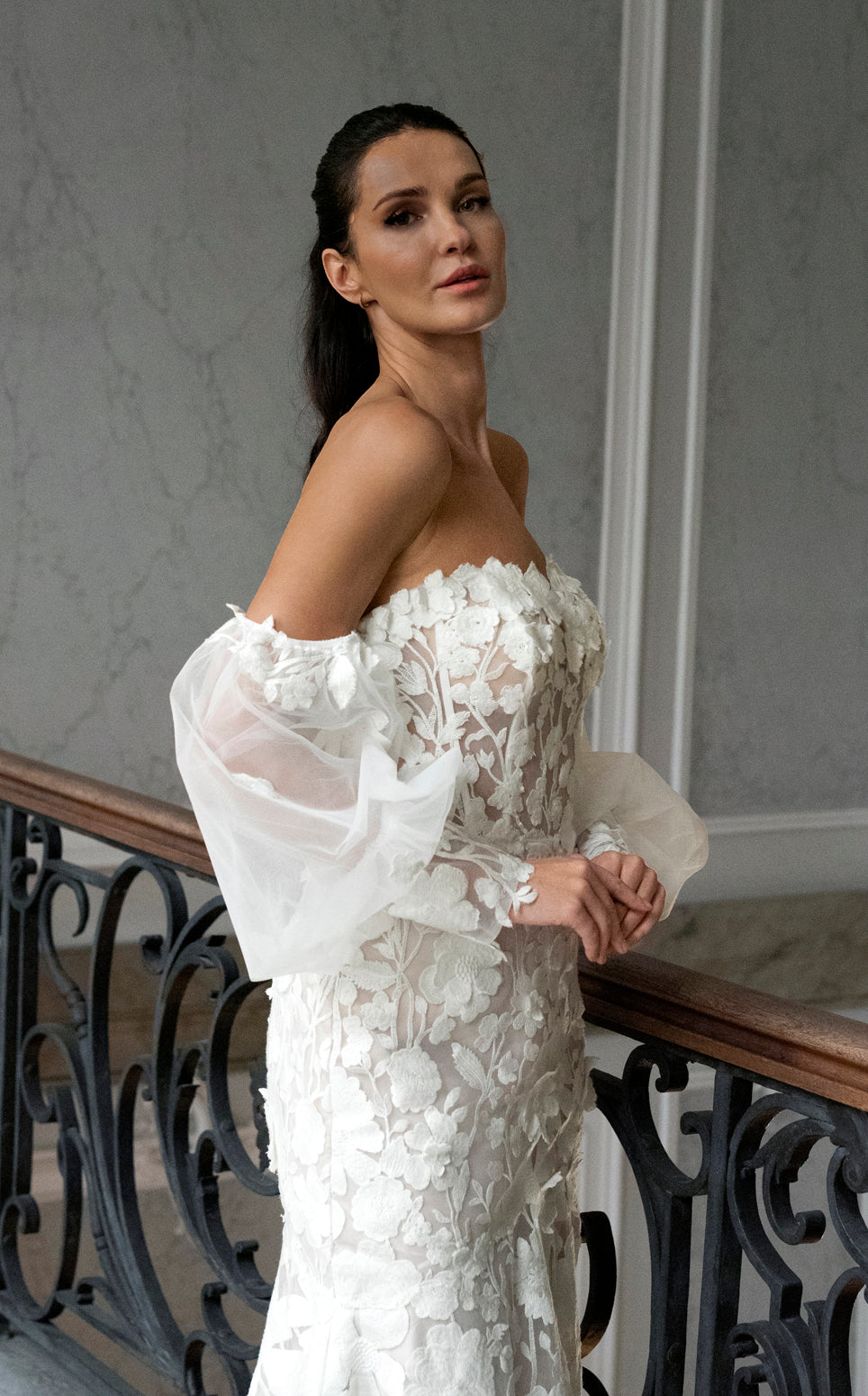 - Ærmer: Transparente ballonærmer (off-shoulder)