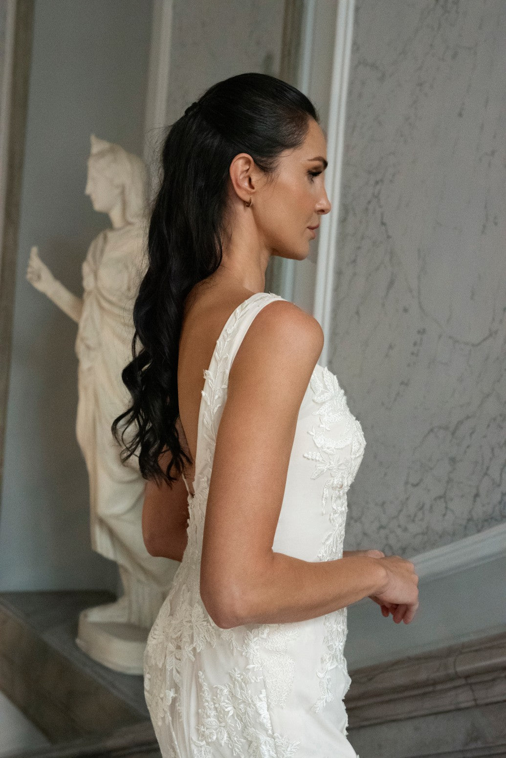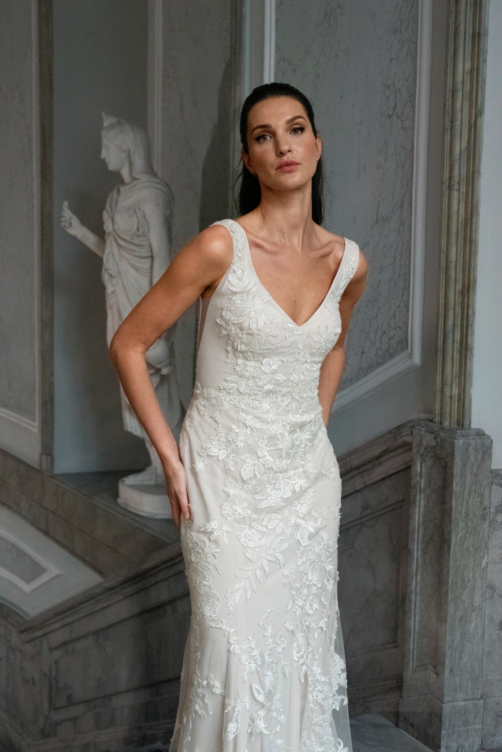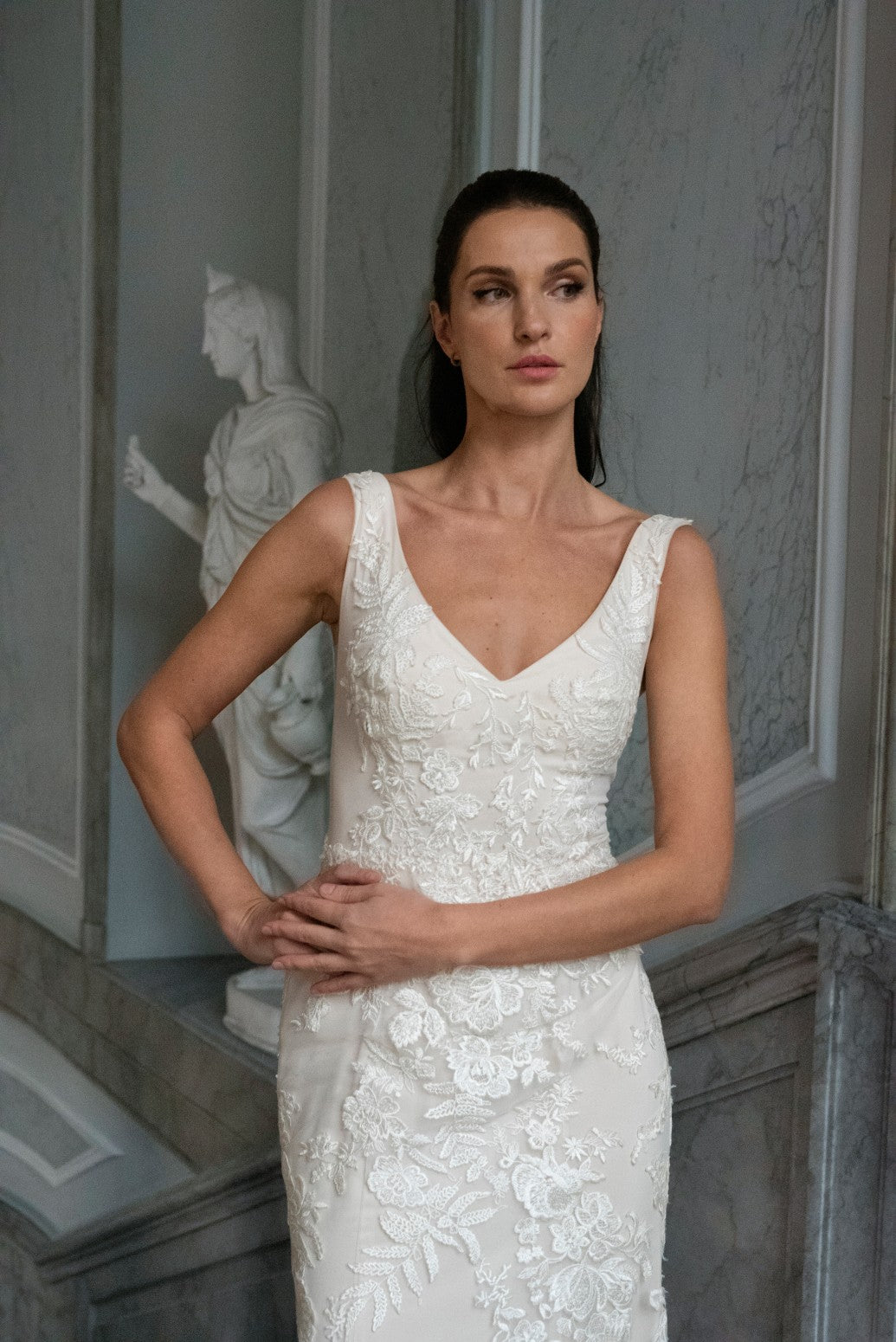 - Slank silhuet med blødt slæb