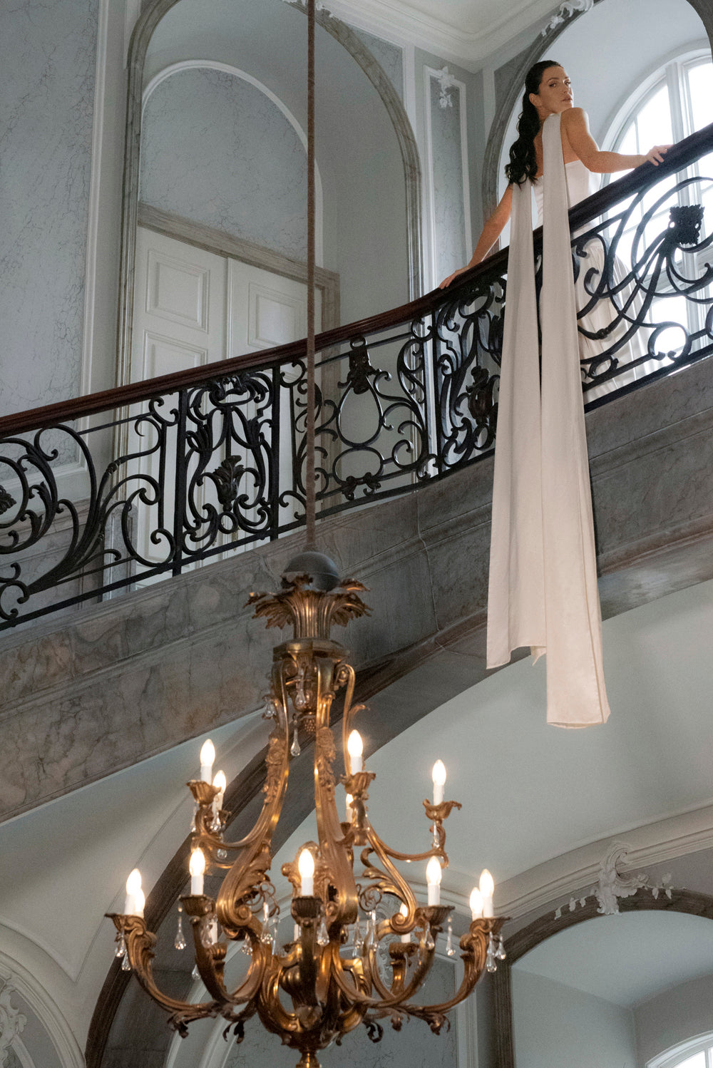 Mila er en minimalistisk, stropløs brudekjole i satin med stilrent snit, fyldigt skørt og en eksklusiv cape-effekt – et ikonisk look hos Karim Design i København.
