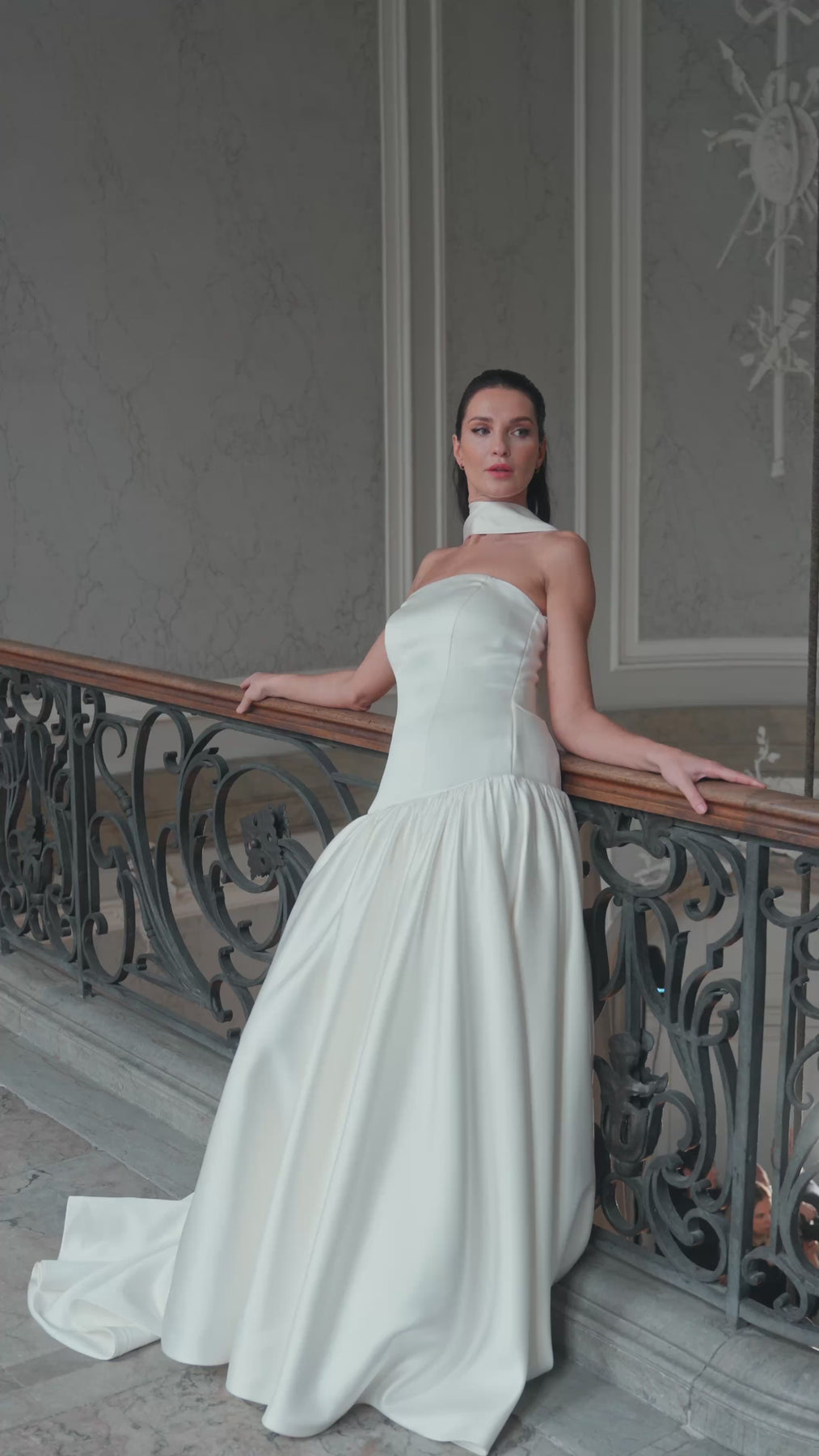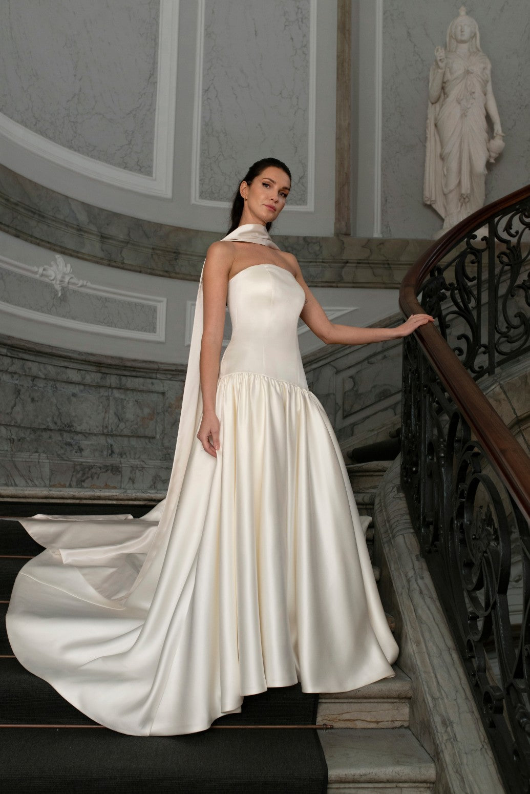 • Stropløs satin brudekjole i minimalistisk, luksuriøst design