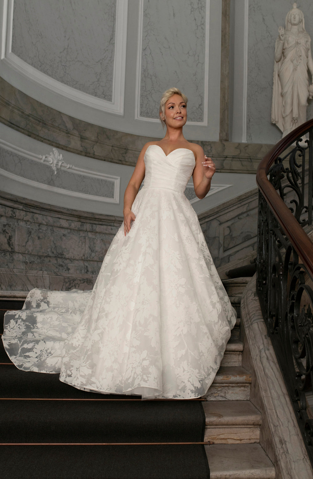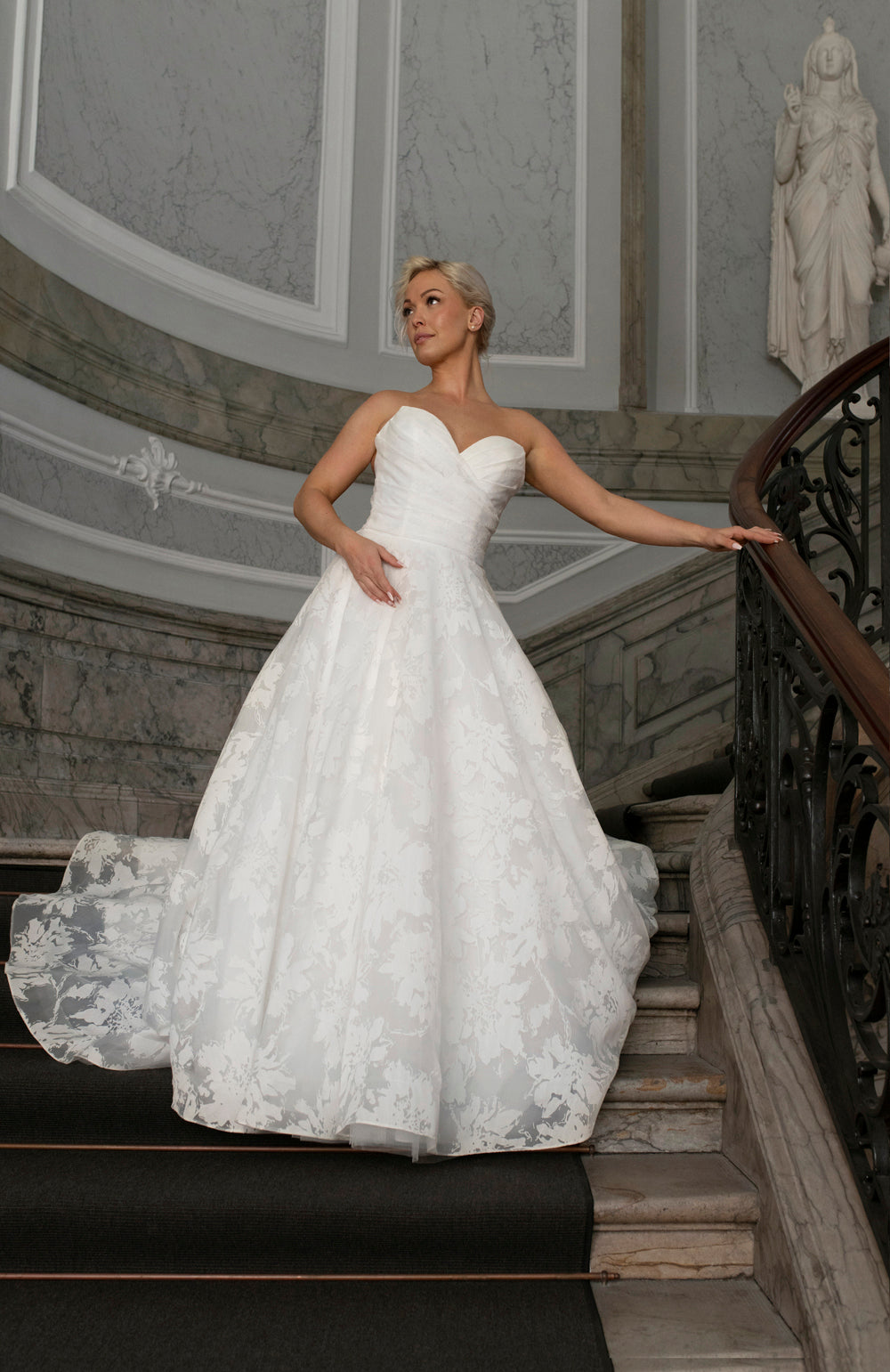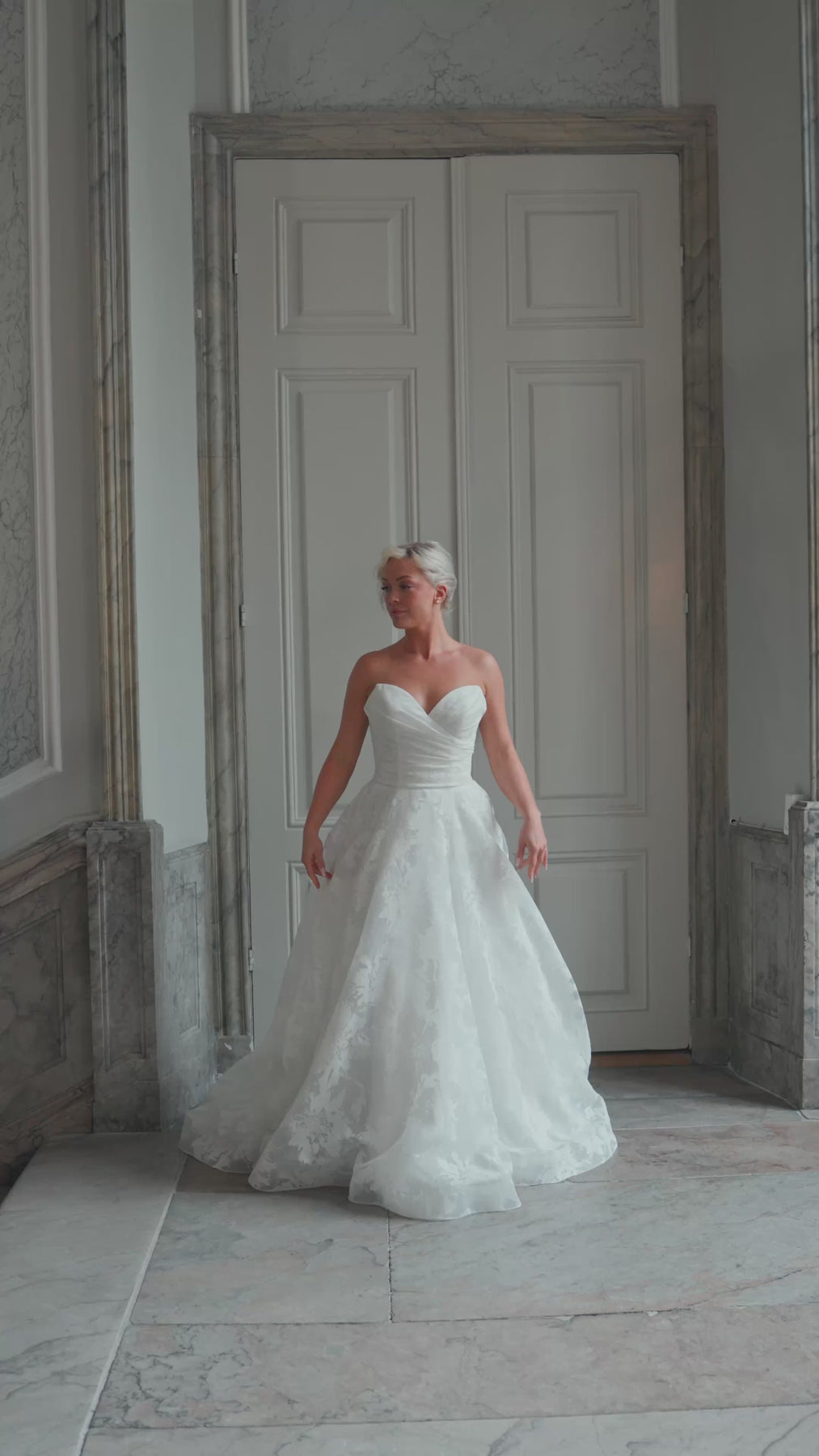 Thea er en klassisk stropløs brudekjole med sweetheart, markeret talje og eksklusivt jacquardskørt – et tidløst valg hos Karim Design i København