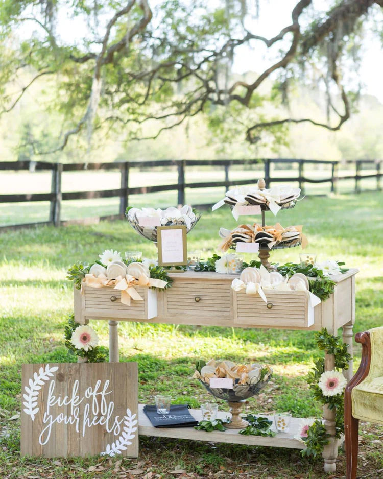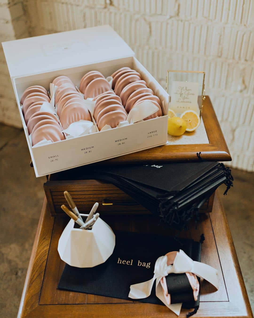 Ikke nok med at hvert par inkluderer et satinbånd, der også fungerer som hårbøjle, dine gæster får også en særlig taske til høje hæle til at opbevare deres smukke stiletter i, når de er færdige med jobbet. Æskesættene indeholder 20 par fra små til store, og tro os, når vi siger, at det bliver det nemmeste display, du nogensinde har lavet.