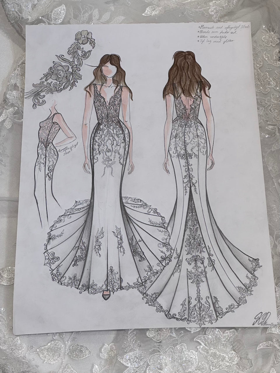Når du vælger Costume Design kan du sætte dit eget touch på din brudekjole. Uanset om du har fundet inspiration fra de sociale medier, som du vil have inkorporeret, eller om du ønsker at kombinere flere af vores kjoler, så skaber vi din kjole ud fra dine ønsker. Når du har fundet din drømmekjole, laver vi den på 3-4 måneder. Dine mål bliver taget og vi sørger for at finde den rigtige størrelse til dig.